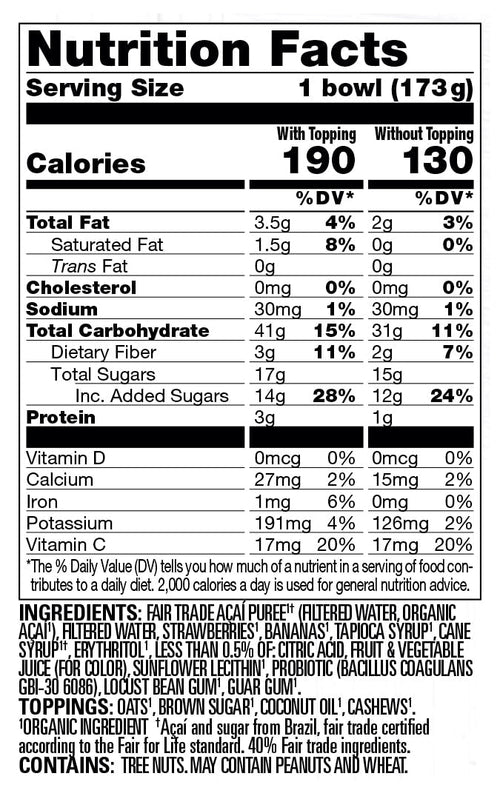 ORGANIC FAIR TRADE AÇAÍ PUREE* (FILTERED WATER, ORGANIC AÇAÍ), FILTERED WATER, ORGANIC STRAWBERRIES, ORGANIC BANANAS, ORGANIC TAPIOCA SYRUP, ORGANIC CANE SYRUP*, ORGANIC ERYTHRITOL, LESS THAN 0.5% OF: CITRIC ACID, FRUIT & VEGETABLE JUICE (FOR COLOR), ORGANIC SUNFLOWER LECITHIN, PROBIOTIC (BACILLUS COAGULANS GBI-30 6086), ORGANIC LOCUST BEAN GUM, ORGANIC GUAR GUM.